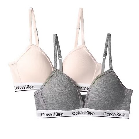 2 let-polstrede pull-on bh-er til pigerne, en grå og en rosa. Bh-erne har justerbare stropper og på elastikbåndet er printet Calvin Klein.