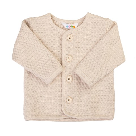 Joha baby cardigan i en smuk beige nuance med fin strikket boble-struktur, der giver et eksklusivt og hyggeligt udtryk. Cardiganen har lange ærmer og gennemgående knapper foran, som gør den nem at tage af og på – perfekt til de mindste.