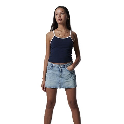 Nederdelen er fremstillet i slidstærk denim med en flot struktur, som giver et tidløst og moderne look. Den korte mini længde og mid waist pasform skaber et trendy udtryk, der passer perfekt til både t-shirts, toppe og lette skjorter.