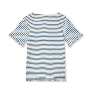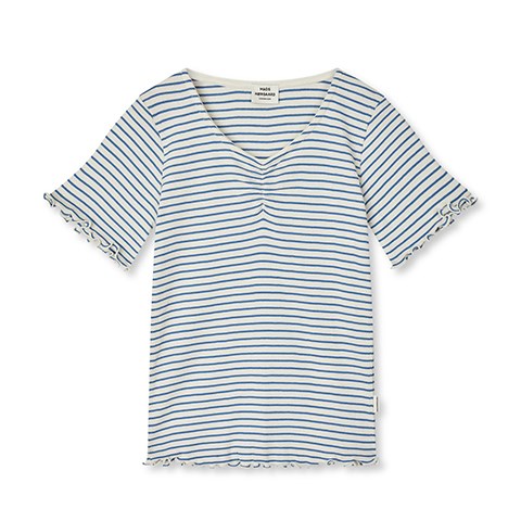 Blød kortærmet t-shirt med striber. T-shirten har v-udskæring med drapering, og flæsede kanter. T-shirten er tætsiddende med god elasticitet.