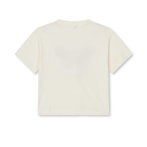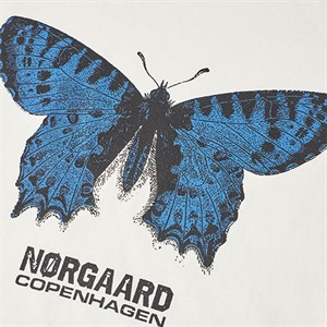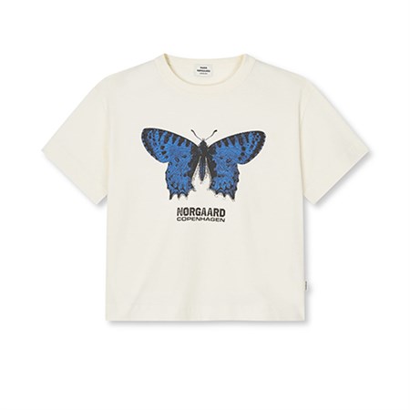 Blød boxy t-shirt med print af sommerfugl og Nørgaard logo på forsiden.