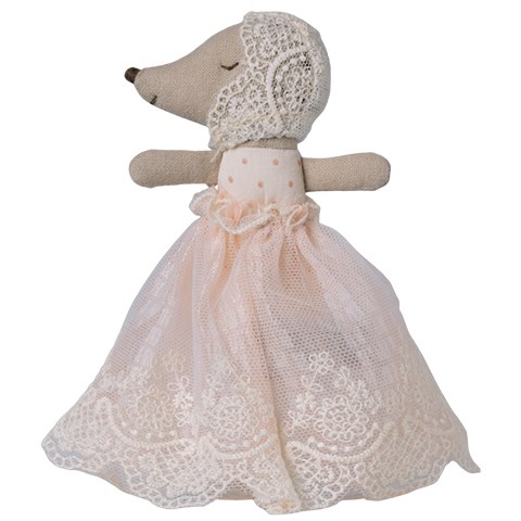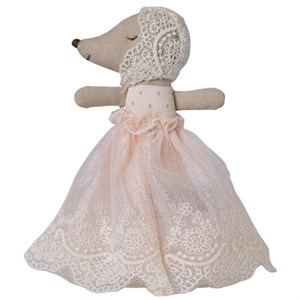 Med sit rolige udtryk og sit delikate design indfanger babymusen essensen af Mailegs poetiske fortællinger, hvor selv livets største begivenheder bliver fortalt i børnehøjde. Dåbskjolen falder let og elegant omkring den lille mus og skaber en stemning af tradition, nærvær og kærlighed.