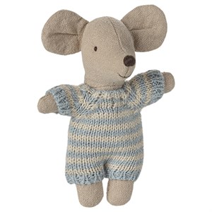 En lille musebaby i en blød og stribet strikdragt. Den sover i timevis i sin lille vatterede babylift.