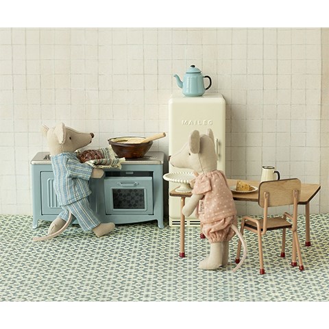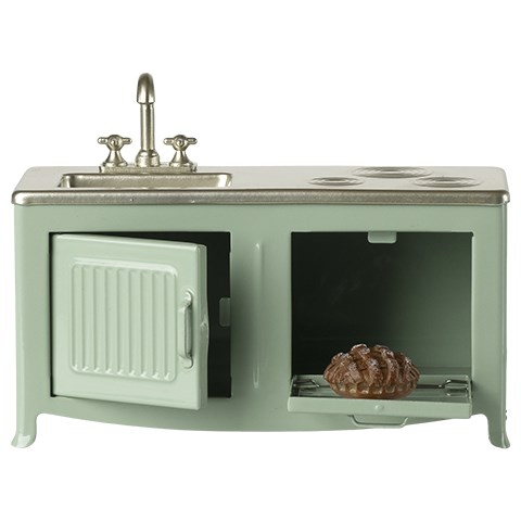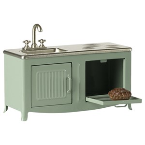 Hjertet i ethvert hjem er køkkenet. Dette metal køkken har en smuk farvetone og har mange fine detaljer såsom skabslåge, vask og en ovn med nybagt tærte. Den passer perfekt i størrelsen til musefamilien.