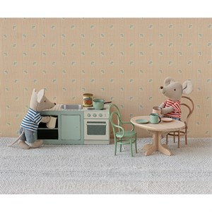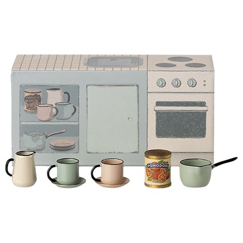 Flot køkken, der passer til musene. Køkkenet leveres med 2 kopper, 2 tallerkener, 1 kasserolle, 1 kande og 1 dåse. Køkkenvasken er lavet af metal for et realistisk udseende. Køkkenet passer perfekt til SuitCasa musehuset.