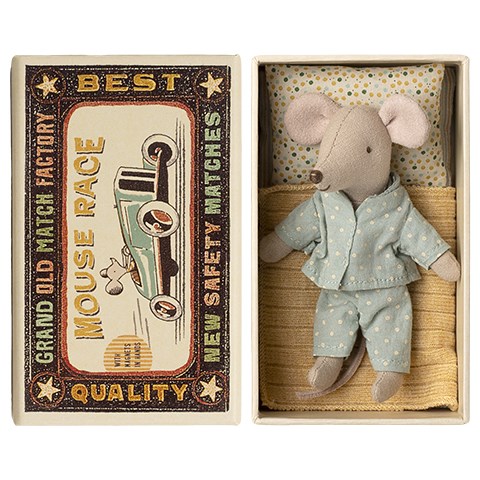 Den fine Lillebror Mus er klar til timevis af leg og sover godt og trygt i den lille tændstikæske. Tøjet og sengetøjet er lavet af de blødeste stof med unikke print i smukke farver. Musen har magneter i hænderne.