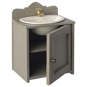 En smuk vintage metalvask med en gylden vandhane. Vasken kommer i et træskab, der har malede detaljer, som fuldender vintage looket. Denne vintage vask passer perfekt i Maileg dukkehus og badeværelse.