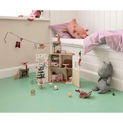 Velkommen til SuitCasa - et lille transportabelt hus. Det passer i størrelsen lillebror og lillesøster mus. Der medfølger 2 sæt blødt sengetøj til dine venner, men du kan købe flere andre små møbler til at dekorere huset.