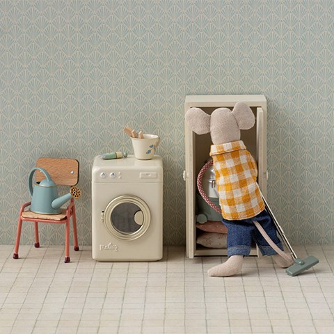Enhver travl husholdning har brug for en hjælpende hånd til vasketøjet og en vaskemaskine er den rigtige løsning. Den er lavet i metal og malet i en råhvid farve med mange detaljer, der gør den uundværlig i legen. Perfekt størrelse til musefamilien.
