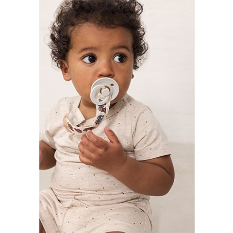 Den praktiske og stilfulde Alo Embroidery suttesnor fra MarMar Copenhagen holder sutten inden for rækkevidde og kombinerer funktionalitet med et sødt design. Suttesnoren har en gummiring og en sikker træ-/metalklips, som nemt kan fastgøres til barnets tøj.