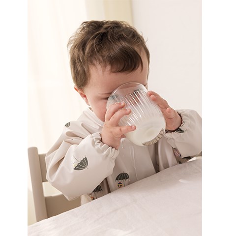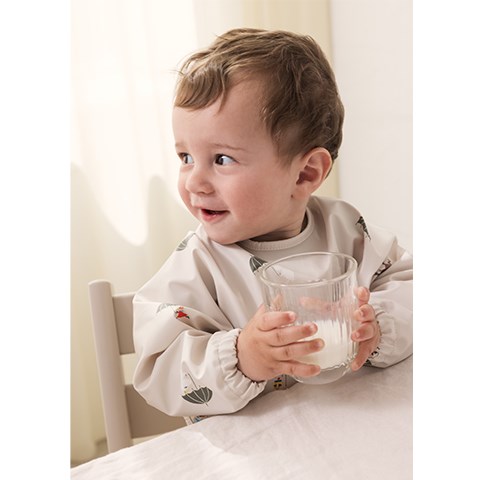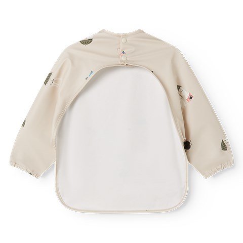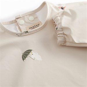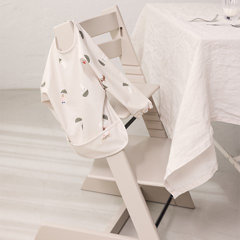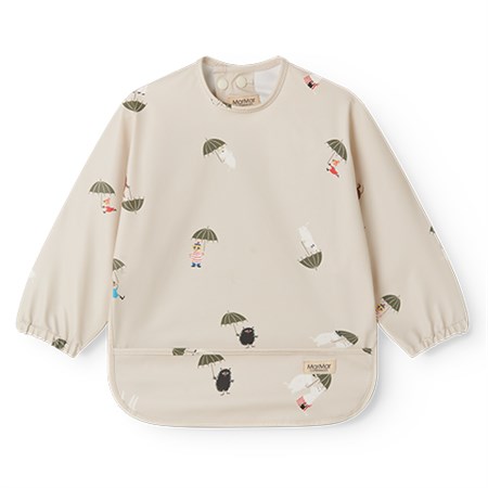 Spiseforklæde med Mummi trolde print. Forklædet , som har lange ærmer og knaplukning i ryggen, har vandafvisende coating, så det er let at tørre af. Det er fremstillet i en let og blød økologisk bomulds kvalitet.