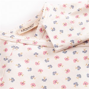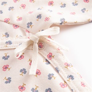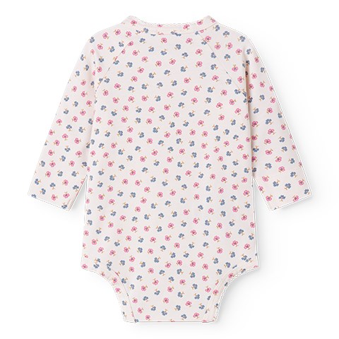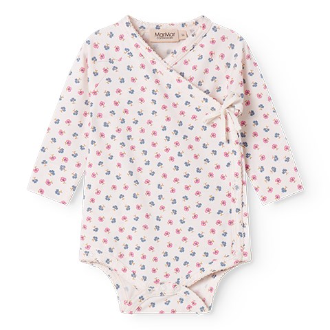 Blød blomsterprintet slå-om body. Bodyen lukkes med bånd og trykknapper i siden samt trykknapper i bunden. Bodyen er fremstillet i jersey med elastan picotkanter, og den er blød strækbar og behagelig at have på, god og åndbar kvalitet, der holder form og farve.