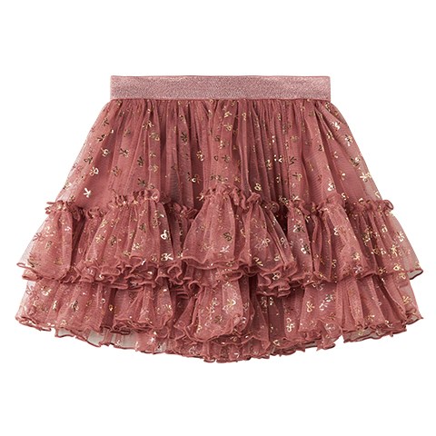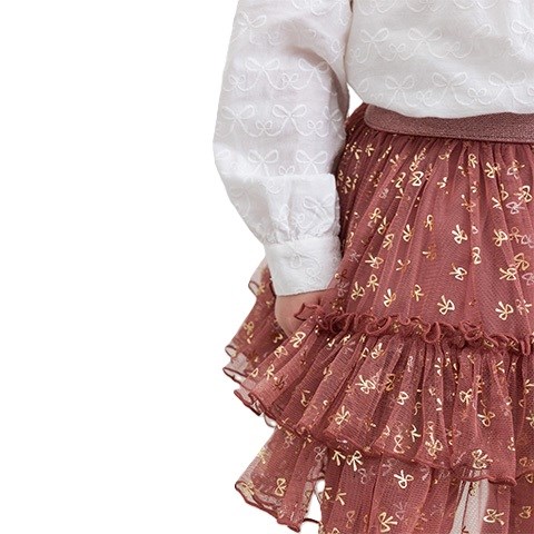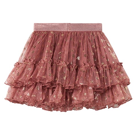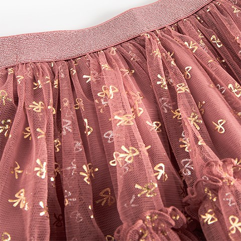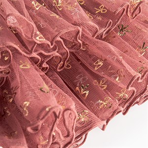 Fint voluminøst tylskørt med sløjfer med guldglitter til julen eller andre fester. Skørtet har en elastikkant i taljen og bomuldsfoer.