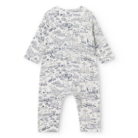 Det søde Mumi print giver dragten et charmerende og legende udtryk. Dragten kan åbnes helt op med trykknapper fra halsen og ned langs begge ben, hvilket gør den nem at tage af og på og gør bleskiftning hurtig og praktisk.