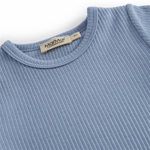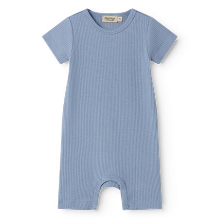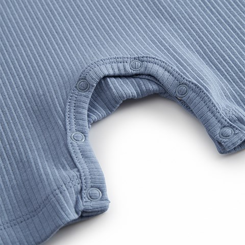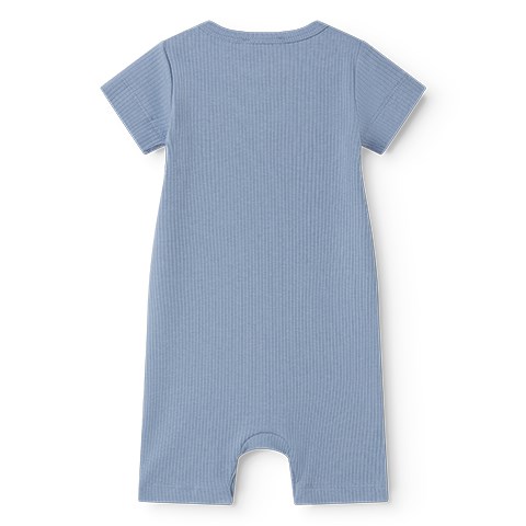 Kortærmet ribstrikket romper med korte ben, der lukkes med trykknapper mellem benene, så det er nemt at skifte ble. Romperen er blød og strækbar, og behagelig at have på.