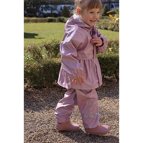 Gør regnvejrsdage til legedage med dette smarte og funktionelle regnsæt fra Mikk-Line i den flotte farve Mauve Shadows med cool metallic finish. Sættet er designet til aktive børn, der elsker at hoppe i vandpytter, glide på våde rutsjebaner og lege frit – uanset vejret.