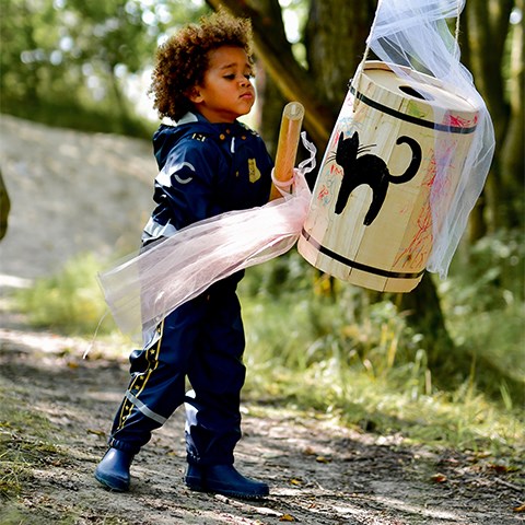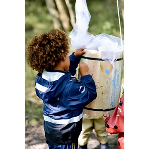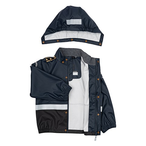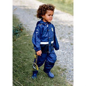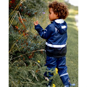 Sættet består af regnjakke og regnbukser, designet til maksimal komfort og bevægelsesfrihed – så barnet kan lege frit, uanset vejret.