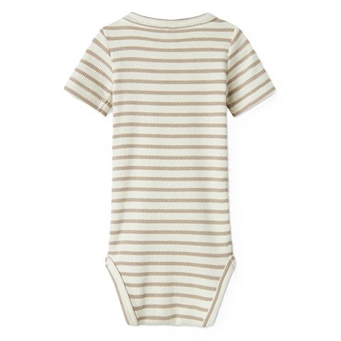 Superblød kortærmet ribbody med fine striber og trykknaplukning ved halsen og forneden.
