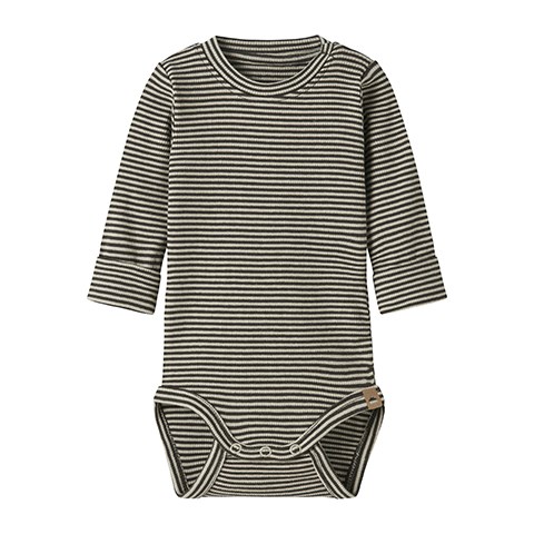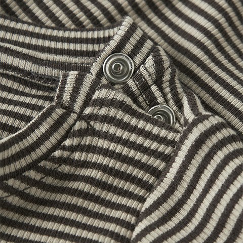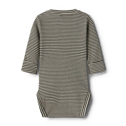 Blød stribet rib body i økologisk bomuld. Bodyen har trykknaplukninger, og er lavet i ribstrik, som har et lodret, stribet mønster og god elasticitet, så den er behagelig at have på. Normal pasform.