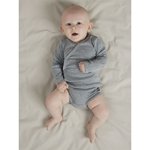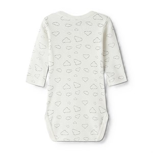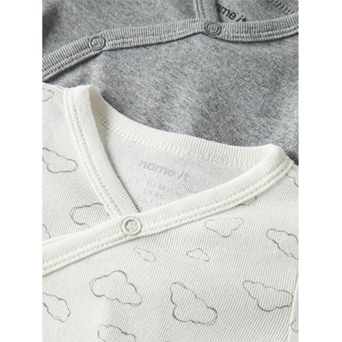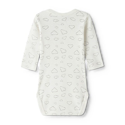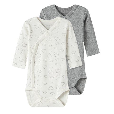 2 langærmede rib slå-om bodyer, den ene med skyprint og den anden ensfarvet. Bodyerne har trykknaplukning, og er fremstilet i ribstrik, som giver god elasticitet, så de er behagelige for baby at have på.