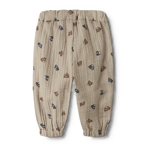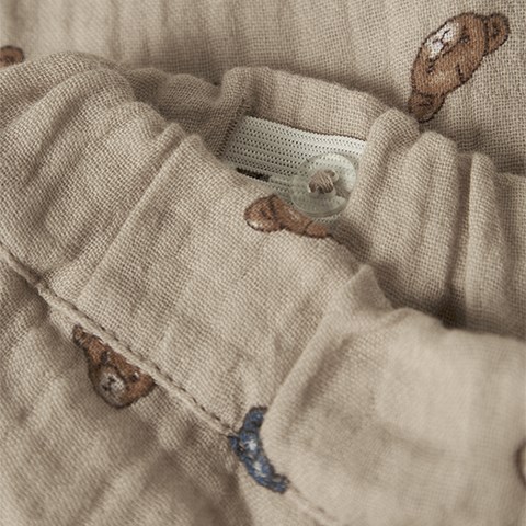 Fine bukser med bamseprint og justerbar talje. Bukserne har elastik i kanterne, og er i normal pasform. De er fremstillet i muslin, som er et let stof med en tekstureret og blød overflade.