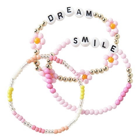 3 fine perlearmbånd med Dream og Smile bogstaver på to af dem.