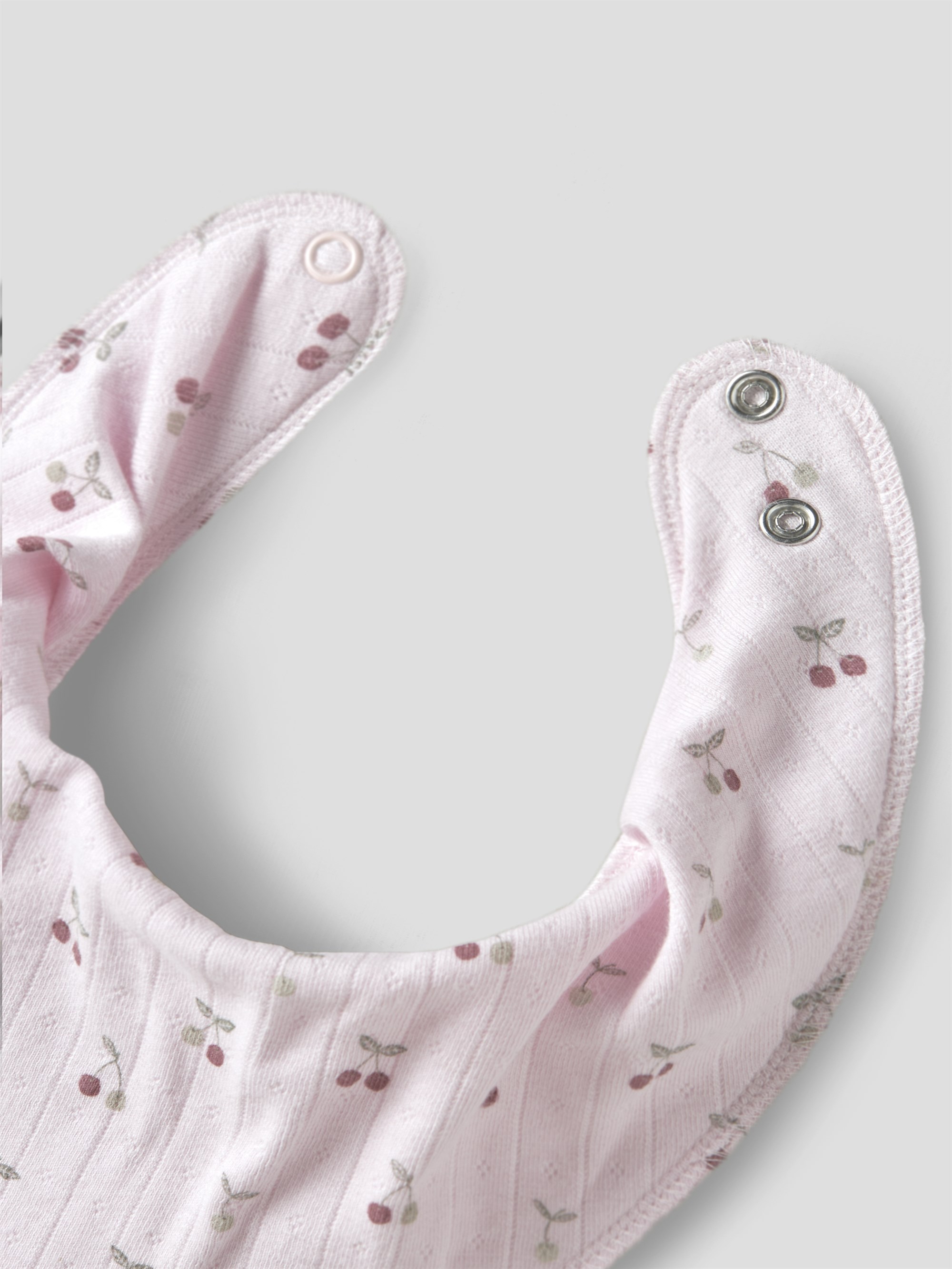 Den er lavet i en blød ribstrikket kvalitet med god elasticitet og et fint kirsebær-print, som giver en behagelig pasform og et klassisk look. Det fine print over hele produktet giver et sødt og stilfuldt udtryk, der passer perfekt til babyens outfit.