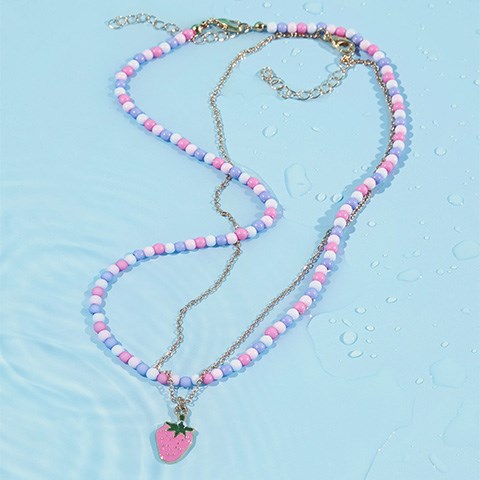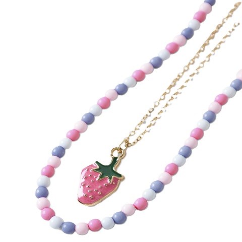 2 halskæder, den ene med perler, og den anden med gylden kæde og fint jordbær vedhæng.