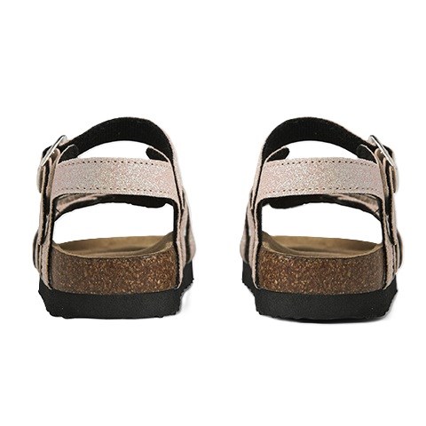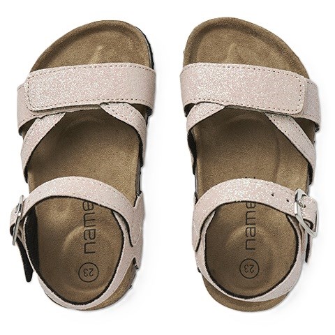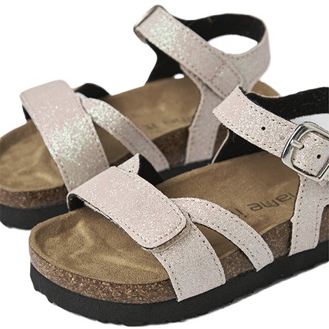 Fine sandaler med glitterdetaljer, korksåle, spændelukning, og velcrolukning.
