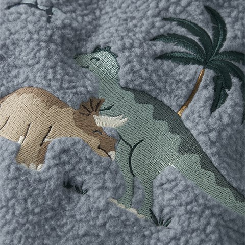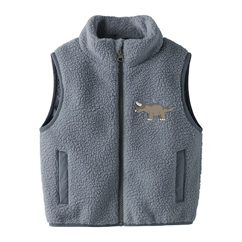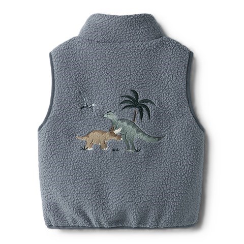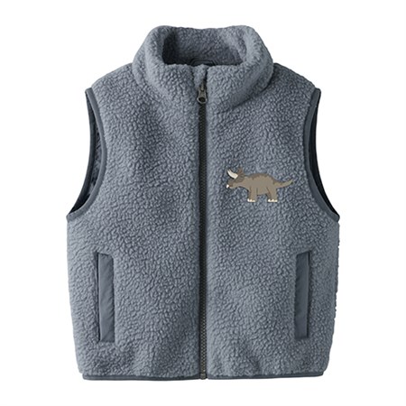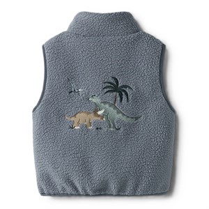 Lækker teddyvest med seje broderede dinosaurer på for- og bagside. Vesten har høj hals, lynlås med hagebeskytter samt sidelommer.