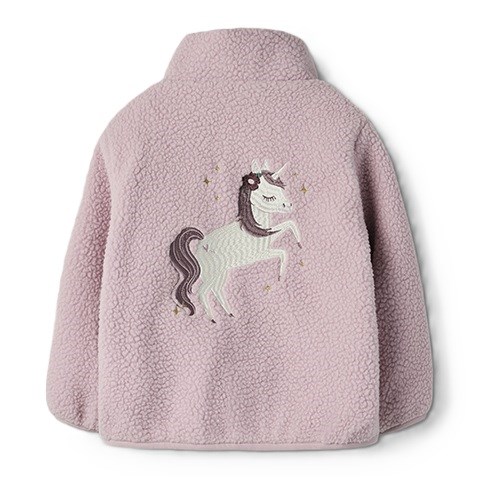 Fin jakke med hjertebroderi på forsiden, og broderet enhjørning på bagsiden. Jakken har høj hals, sidelommer, lynlås og lynlåsbeskytter for at forhindre lynlåsen i at gribe fat i huden.