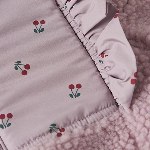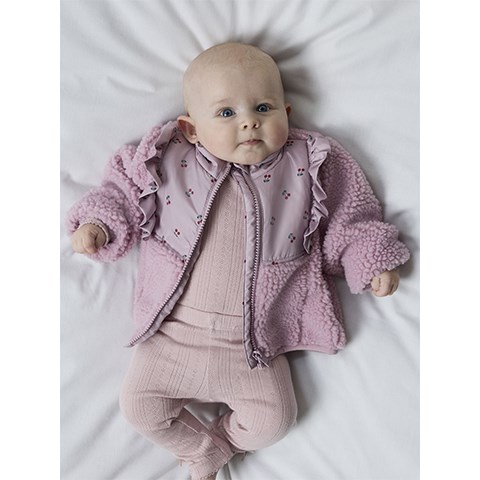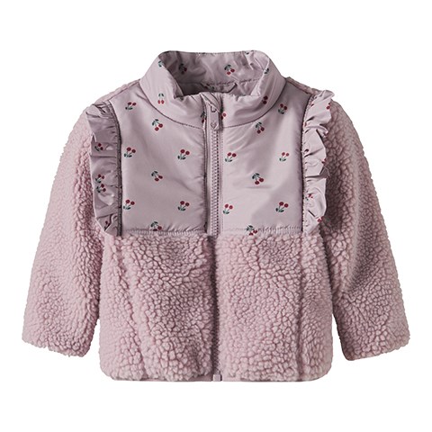Den fineste Teddy jakke til baby med kirsebærprint og flæsedetaljer. Jakken har høj hals og lynlåslukning samt lynlåsbeskytter, der forhindrer lynlåsen i at gribe fat i huden. Teddy er et letvægtsstof med en blød overflade for en behagelig og blød følelse.