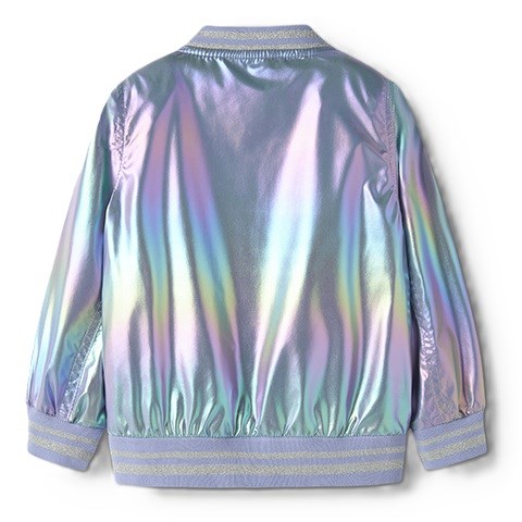 Cool bomber jakke med folieprint, så den har et skinnende look. Jakken har sidelommer samt lynlås og lynlåsbeskytter for at forhindre lynlåsen i at gribe fat i huden. Den har elastiske manchetter og elastisk kant forneden.