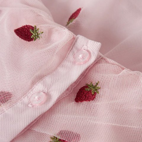 Denne fine spencerkjole fra Name It er lavet i let og elegant tyl, som giver et luftigt og festligt udtryk. De broderede jordbær tilføjer et legende og charmerende look, der gør kjolen perfekt til både hverdag og særlige anledninger.