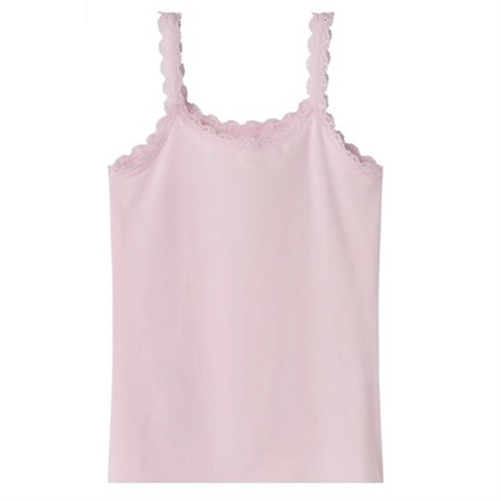 Designet er enkelt og stilrent med rund hals og smalle stropper, mens den fine blondekant tilfører et elegant og feminint touch. Slim fit pasformen gør toppen ideel både alene eller som undertrøje.