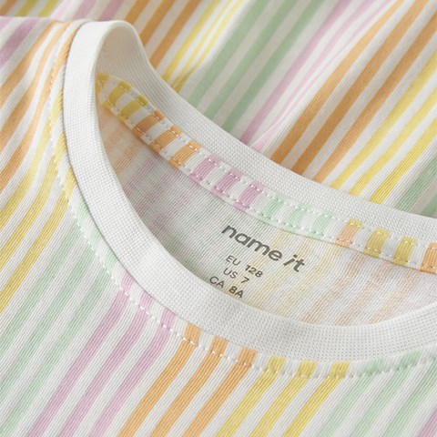 Giv garderoben et friskt og moderne udtryk med denne Name It Vigga kjole i Bright White med Cool Stripe all-over print. En alsidig kjole, der passer perfekt til både hverdag, skole og afslappede sommerdage.