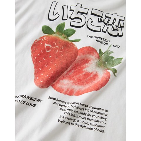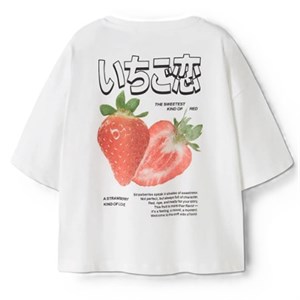 Den er fremstillet i blød og let jersey af 100% økologisk bomuld, som føles behagelig mod huden og giver god bevægelsesfrihed. Det fine fotoprint med jordbær på både for- og bagside skaber et legende og iøjnefaldende udtryk med flotte, detaljerede farver. Den afslappede pasform giver et cool og casual look, som er nemt at style.