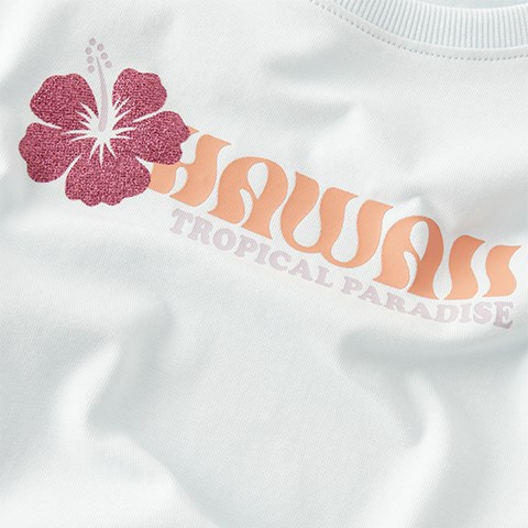 Denne T-shirt fra Name It har et fint og farverigt print med blomster og Hawaii-inspiration på fronten, som giver et friskt og sommerligt look. Perfekt til piger, der elsker sol, farver og en afslappet stil.