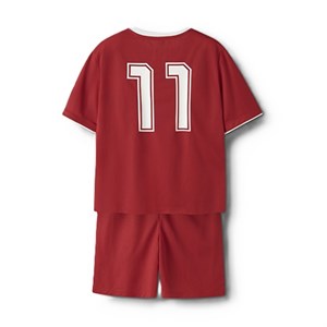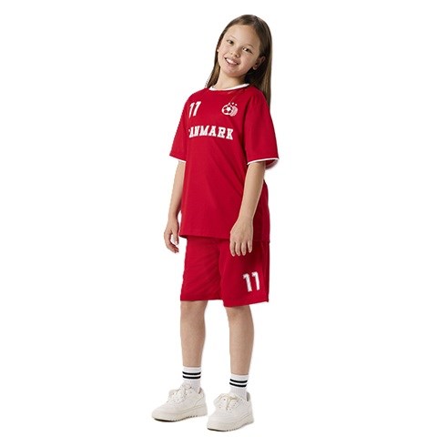 T-shirten har “Danmark” og nummer 11 printet på forsiden samt 11 på ryggen, hvilket giver et klassisk landsholdsinspireret udtryk. Shortsene matcher perfekt med et stort 11-print på det ene ben og en justerbar talje, som sikrer en god og fleksibel pasform.