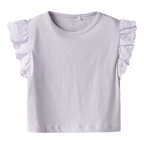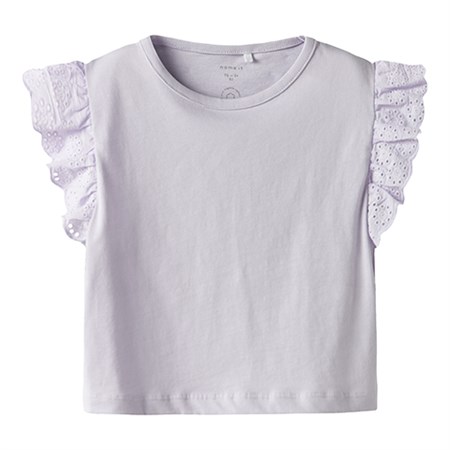 Name It NMF HAZEL Cap Sleeve Top i Orchid Petal er en feminin og stilfuld t-shirt til piger, perfekt til både hverdag og særlige lejligheder. Den smukke lilla nuance giver et blødt og moderne look, mens den fine broderidetalje tilfører et elegant og sødt udtryk.