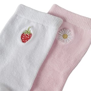 Sættet indeholder to forskellige designs: et par hvide strømper med et sødt broderet jordbær og et par lyserøde med en fin broderet blomst. Strømperne er lavet i en blød og strækbar kvalitet, som sikrer høj komfort hele dagen og en god pasform, der bliver siddende.