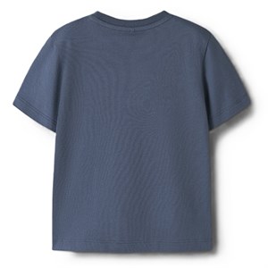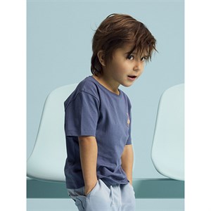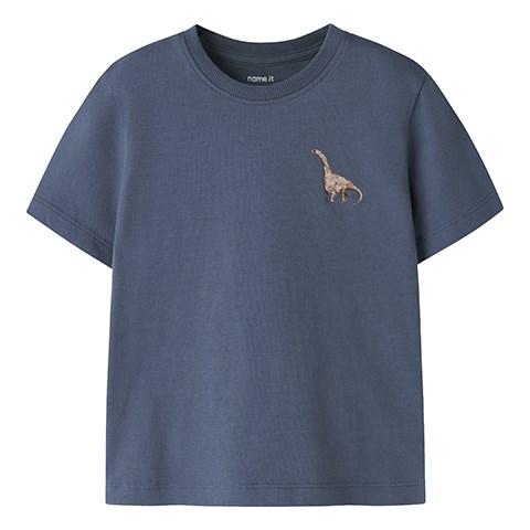 Name It - NMMHIMUS SS NREG TOP, Vintage Indigo. Opdater garderoben med denne cool T-shirt fra Name It, der kombinerer et klassisk design med et legende twist. Den dybe Vintage Indigo farve giver et stilrent look, mens det lille dinosaurprint på brystet tilføjer et sjovt og børnevenligt element.