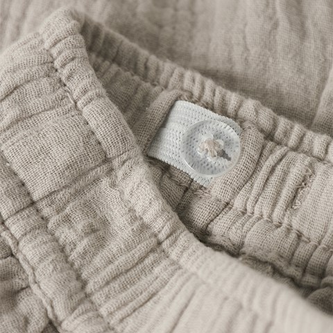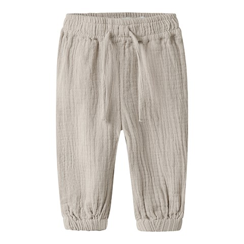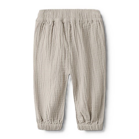 Fine unisex bukser med justerbar talje og elastik i benene. Bukserne er fremstillet i økologisk bomulds muslin, som er et let stof med en blød overflade, så de er behagelig at have på. Pasform: Vide ben.