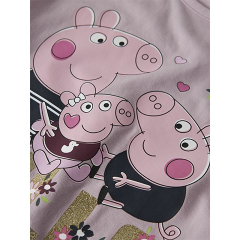 Langærmet t-shirt med glitterprint af Gurli Gris, Gustav Gris og den lille baby Evie Gris. T-shirten er fremstillet i jersey, som er et let og strækbart stof med en blød overflade og inderside, så den er behagelig at have på og giver god bevægelsesfrihed. Normal pasform.