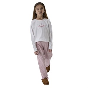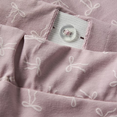 Sødt pyjamassæt i økologisk bomuld med dream printet på den hvide overdel, og sløjfer printet på de lilla py-bukser. Bukserne kan reguleres i taljen. Pyen er fremstillet i jersey, som er et let og elastisk stof med en blød overflade og inderside, så den er behagelig at have på og giver god bevægelsesfrihed.