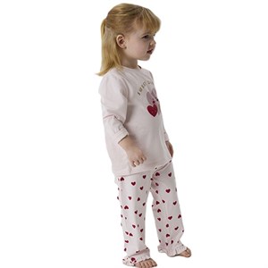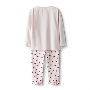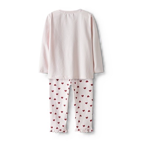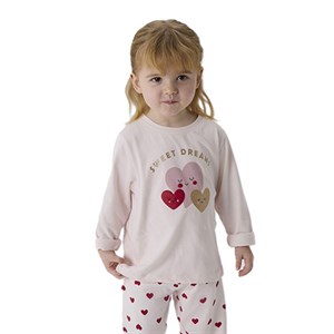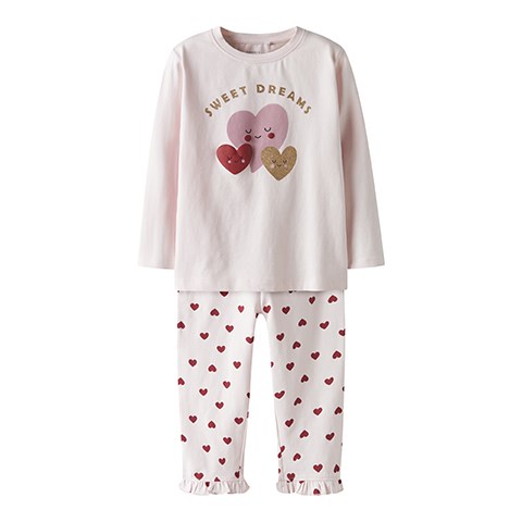 Sødt pyjamassæt i økologisk bomuld med sweet dream og glimmer printet på overdelen, og hjerter printet py-bukserne. Bukserne kan reguleres i taljen. Pyen er fremstillet i jersey, som er et let og elastisk stof med en blød overflade og inderside, så den er behagelig at have på og giver god bevægelsesfrihed.