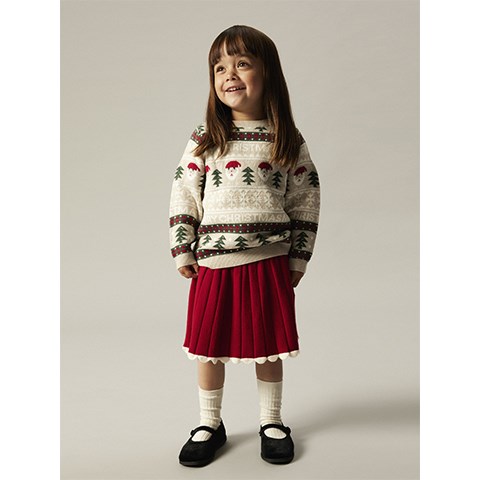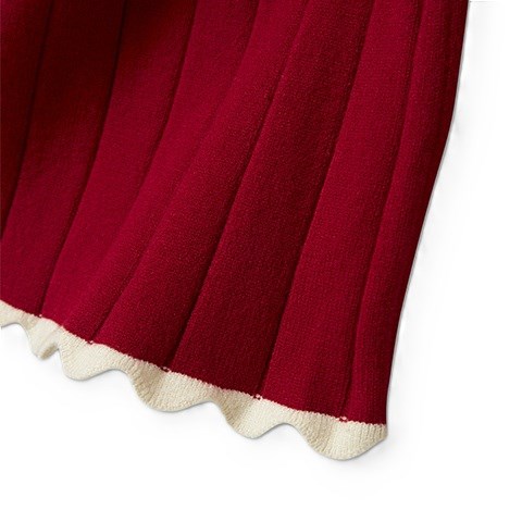 Fin ribstrikket rød julenederdel med hvid flæsekant nederst. Nederdelen er knælang og har elastik i taljen.