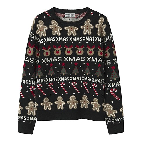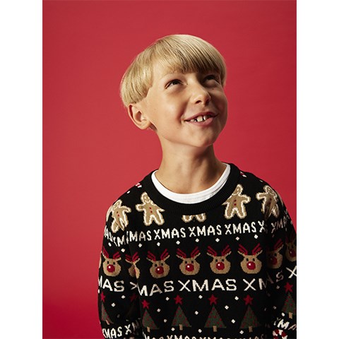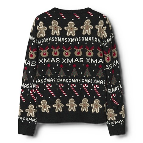 Herlig strikket pullover med julemotiver og ribkanter ved manchetterne. Normal  pasform.
