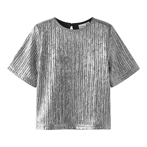 Festlig kortærmet t-shirt med glitterprint. Blusen har knap- og løkkelukning bagpå. Normal pasform.