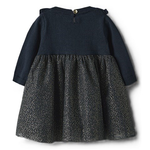 Fin langærmet kjole til enhver festlig begivenhed eller særlig lejlighed året rundt. Kjolen har tyldetaljer, flæser og glitterdetaljer. Knap- og løkkelukning bagpå.